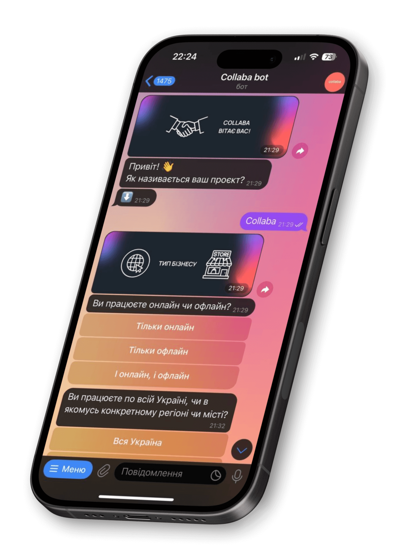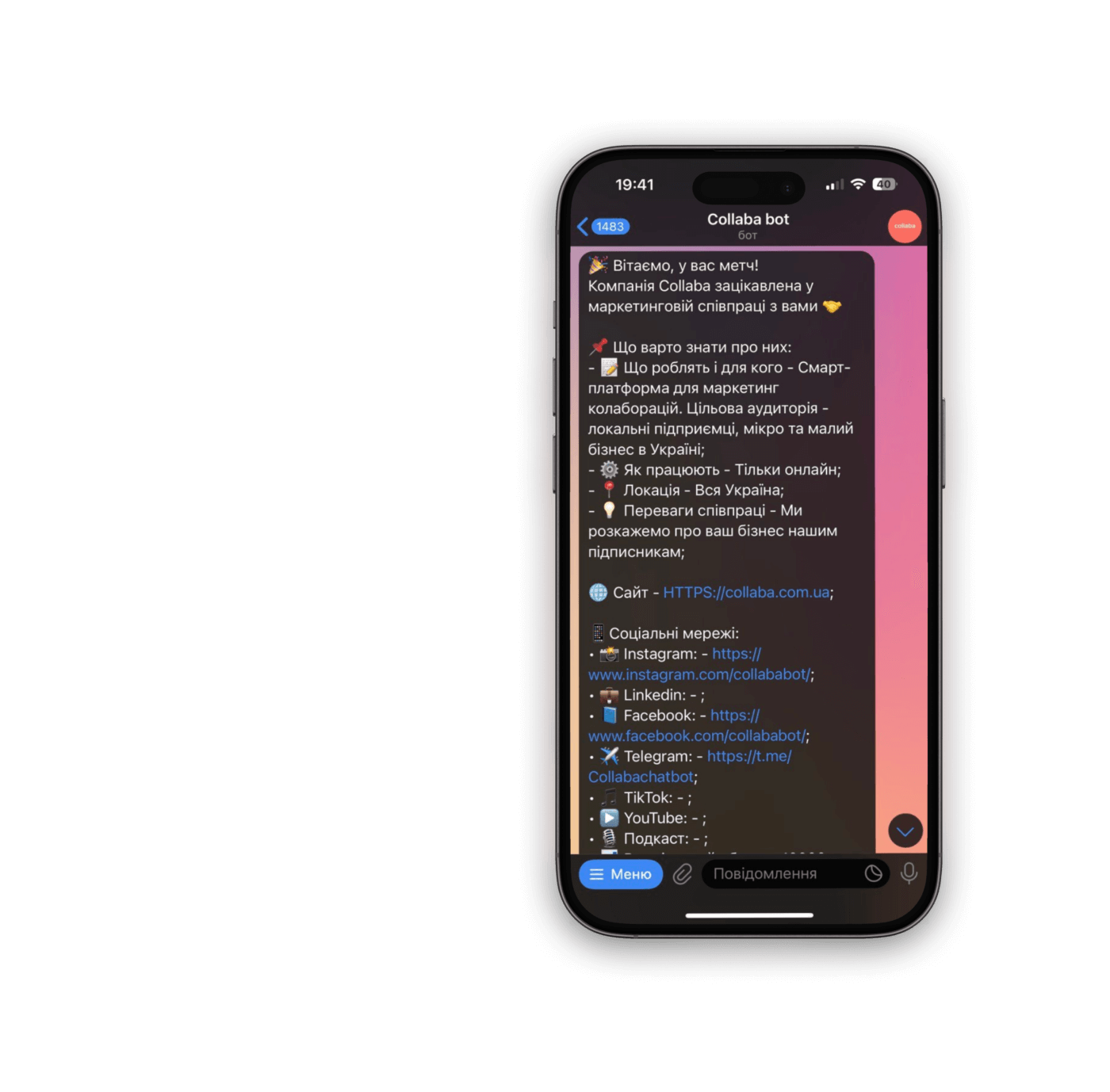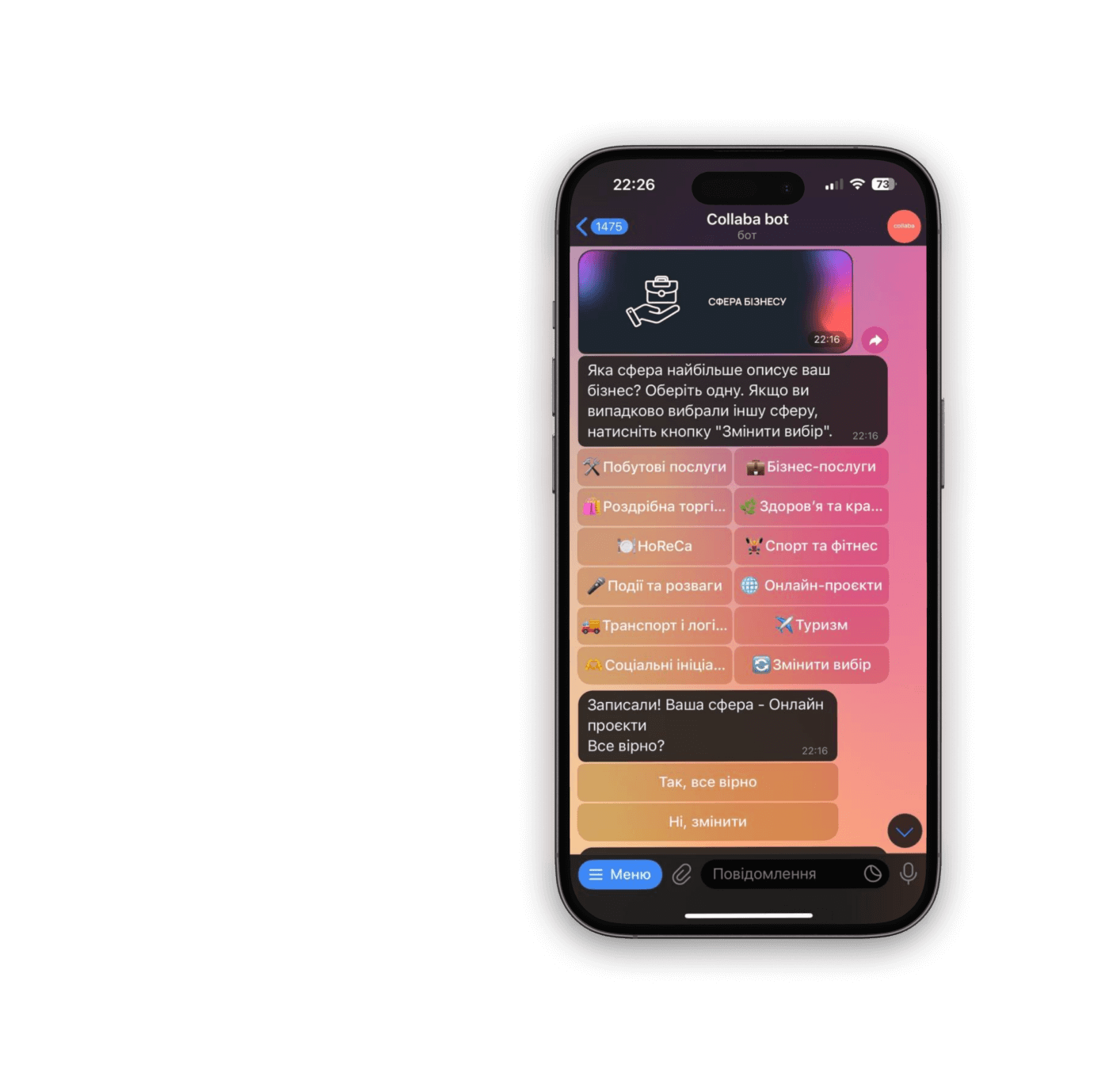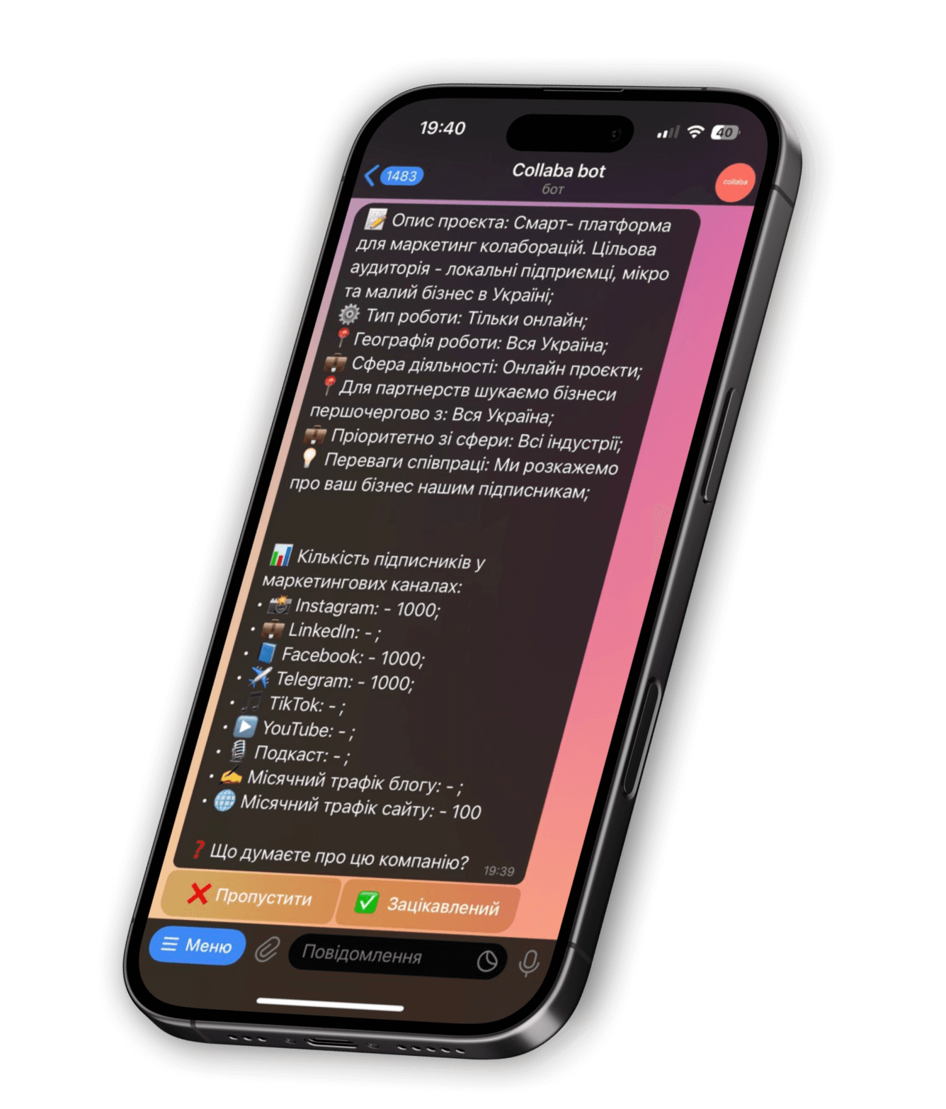 Дуже просто! Реєструєтесь у Telegram-боті, заповнюєте анкету про свій бізнес — і після активації підписки ваш профіль зʼявляється в пошуку. Тепер ви можете переглядати інші бізнеси, обирати потенційних партнерів і починати колаборації.